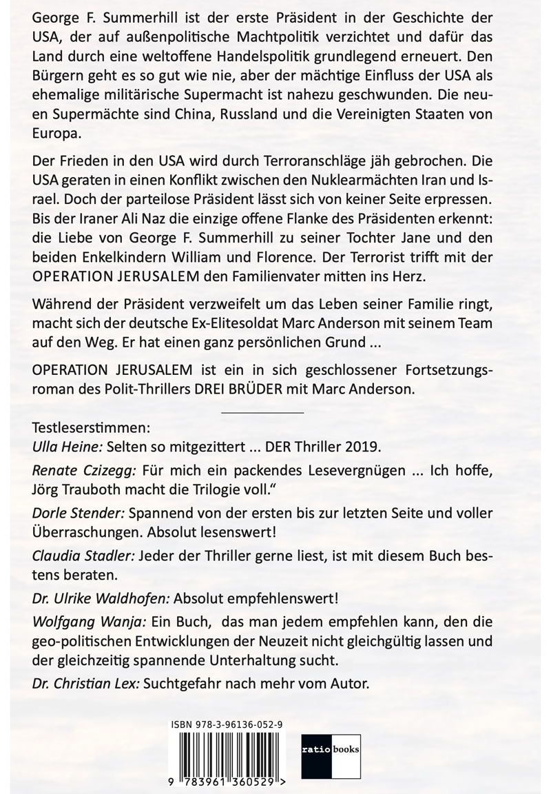 George F. Summerhill ist der erste Präsident in der Geschichte der USA, der auf außenpolitische Machtpolitik verzichtet und dafür das Land auf der Grundlage einer weltoffenen Handelspolitik grundlegend erneuert. Den Bürgern geht es so gut wie nie, aber der mächtige Einfluss der USA als ehemalige militärische Supermacht ist nahezu geschwunden. Die neuen Supermächte sind China, Russland und ein wiedererstarktes Europa. Durch islamistische Terrorakte gegen Einrichtungen der USA gerät der Präsident in einen außenpolitischen Konflikt. Israel fordert ein araberfreies Land ohne palästinensische Autonomiegebiete und wird hierbei von dem Sohn des Präsidenten, David, subversiv unterstützt. Die Terroristen fordern die Aberkennung des Staates Israel und die Anerkennung des Staates Palästina. Der Konflikt zwischen den Nuklearmächten Iran und Israel heizt sich auf. Die Welt steht vor einem Abgrund. Doch der U.S. Präsident lässt sich weder durch Israel noch durch die Terroristen erpressen, bis der Iraner Ali Naz die einzige offene Flanke des Präsidenten erkennt: Die Liebe von George F. Summerhill zu seiner Tochter Jane und den beiden Enkelkindern William und Florence. Ali Naz trifft mit der Operation Jerusalem den Familienvater mitten ins Herz. Während der Präsident um das Leben seiner Familie ringt, macht sich der deutsche Ex-Elitesoldat Marc Anderson mit seinem Team auf den Weg.